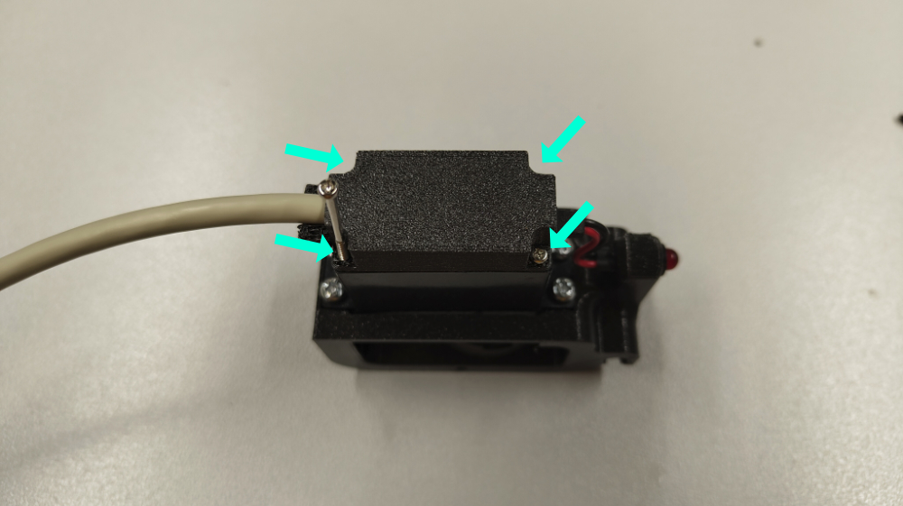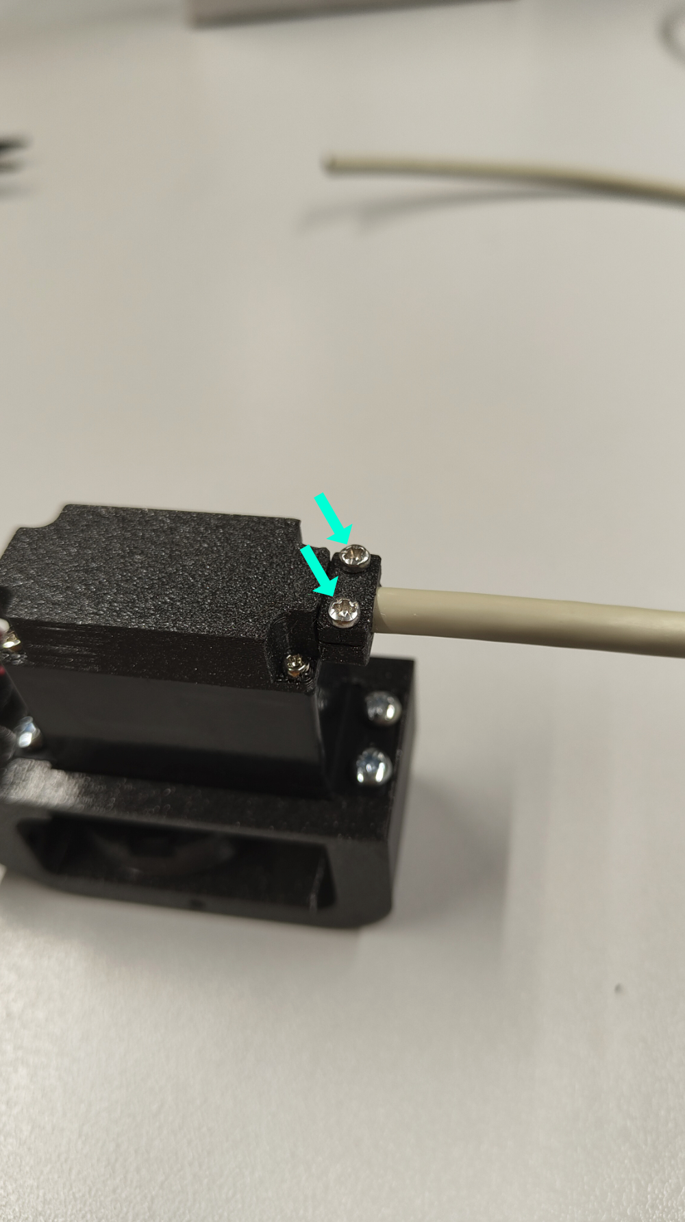 - Screw the cable clamp.stl in place using the two M2x6 screws.