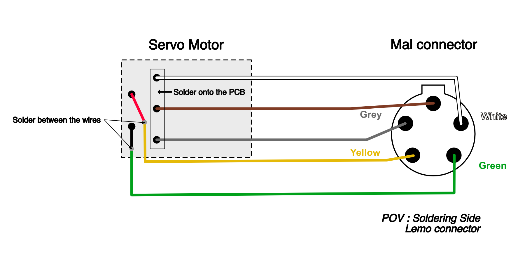 - Solder the strands of the cable onto the pins of the LEMO connector following the diagram.