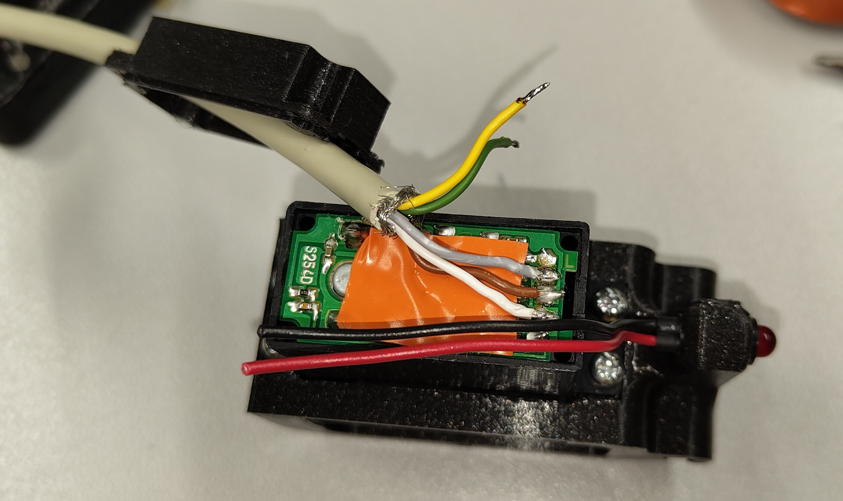 - Ensure that you have reattached the cable gland from the servo motor wires onto the LED cables. Solder the red LED cable to the yellow cable, then solder the black cable to the green one, securing the connections with heat shrink tubing.